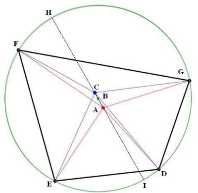 Unter Einhaltung der Axiome der alten Astronomie macht sich Kepler daran, die Marsbahn zu bestimmen, d.h. er sucht nach einer perfekten Kreisbahn, in der allerdings der Beobachtungspunkt B vom Kreismittelpunkt A verrückt ist (Abbildung 4). Auch sei ein Ausgleichspunkt C vorhanden, um den in gleichen Zeiten gleiche Winkel beschrieben werden. Die Punkte A,B,C,H,I sollen auf einer Linie, der Apsidenlinie, liegen. I sei der Punkt der schnellsten und H der Punkt der langsamsten Bewegung. Die vier gemessenen Marspositionen D,E,F,G müssen auf den entsprechenden Kreis passen.