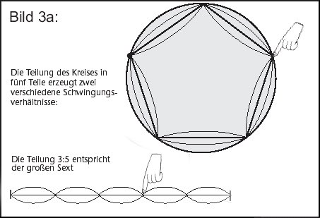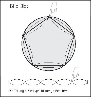 Aus dem Fünfeck entstehen nun zwei konsonante Intervalle, die große Sexte 3:5 und die große Terz 4:5. Sie entstehen dadurch, daß beim Fünfeck einmal der dritte, einmal der vierte Teil festgehalten wird (siehe Abb. 3 a und b):
