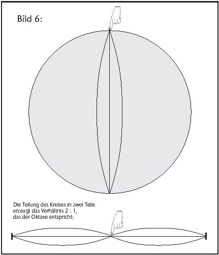 Die harmonischste Proportion aber haben wir noch vergessen: das Verhältnis 1:2, die Teilung in genau die Hälfte der Saite, bzw. den Halbkreis (siehe Abb. 6)! Der Durchmesser erzeugt die Oktave.